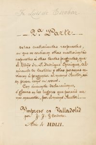 .1552. LIBRO: .(GÓTICO).. .[ESCOBAR, FRAY LUIS DE]:. .2ª PARTE DE LAS CUATROCIENTAS RESPUESTAS, EN QUE SE CONTIENENE OTRAS CUATROCIENTAS RESPUESTAS Á OTRAS TANTAS PREGUNTAS... [Valladolid: Imp. J. J. G. Cordova, 1552.] Portada manuscrita. 4º....