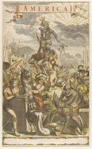 .1671. GRABADO: .(AMÉRICA).. .OGILBY:. .AMÉRICA. Grabado al cobre y coloreado de época, 30 x 18 cm, huella. Grabado para el frontis de la primera edición de la obra sobre América de Arnoldus Montanus.