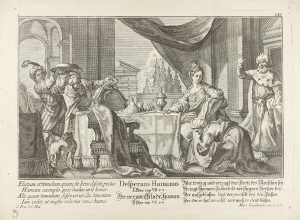 . .HAMAN VA A VISITAR A LA REINA ESTER.. 21 x 31 cm plancha, 24 x 33 cm papel. Representación de la visita que Haman realiza a la reina Ester para que interceda a su favor delante...