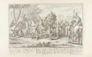 .s. XVII.. GRABADO: .(NUEVO TESTAMENTO).. .ENGELBRECHT, MARTIN:. .FELIPE Y EL EUNUCO. 20,5 x 30,5 cm, plancha, 23 x 37 cm. Representación de la escena de Felipe junto al Eunuco que lee el rollo de Isaías. Con el texto en alemán y latín en plancha.