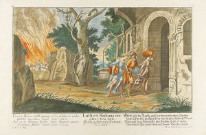 .s. XVII.. GRABADO: .(ANTIGUO TESTAMENTO).. .ENGELBRECHT, MARTIN:. .LOTH EX SODOMA ERIPITUR.. 21 X 31 cm plancha, 34,5 x 23 cm papel. Grabado coloreado de la huída de Sodoma de Lot y su familia, con el texto en latín y alemán en plancha.