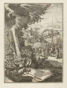 .s. XVII-XVIII.. GRABADO: .(NUEVO TESTAMENTO).. .HARREWIN, JACOBUS:. .CONVERSIÓN DE SAULO.. 19 x 14,5 cm plancha, 22 x 17 cm papel. Grabado al aguafuerte en el que se relata la conversión de Saulo. Firmado en plancha por el artista.