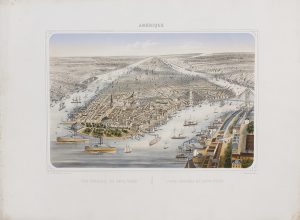 .1875 ca.. GRABADO: .TURGIS, L. Jne.:. .VISTA GENERAL DE NEW YORK. Paris/ NY: Turgis Imp. Ed., sa. Litografía a color. 45 x 55 cm. plancha; 55 x 72 cm. papel. Diminutas manchas del tiempo casi imperceptibles. Bordes oscurecidos con alguna pequeña...