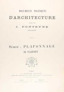 .1880 ca.. GRABADO: .(ARQUITECTURA).. .FONTEYNE, J.:. .DOCUMENTS PRATIQUES D´ARCHITECTURE. SÉRIE: PLAFONNAGE. Paris: Éd. Claesen, 1880 ca. Gran folio. 1 h. + 30 lám. Presentado en carpeta original con la lomera en tela, rozada. Ilustrativas...