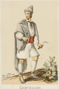 .s. XIX.. GRABADO: .(TIPOS Y TRAJES).. .12 LITOGRAFÍAS CON TRAJES TÍPICOS DE LUGARES DE ESPAÑA.. 12 postales litográficas de 14 x 10 cm sobre cartoné. Representan trajes masculinos y femeninos típicos de: Salamanca, Valencia, Santander,...