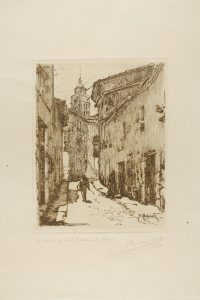 .1930.. GRABADO: .(ARTE).. .CARDUNETS CAZORLA, ALEXANDRE:. .UN CARRER DE SANTA COLOMA DE FARNÉS. Papel: 51,5 x 40,5 cm. Huella: 25 x 19,5 cm. Bella aguafuerte de una calle con vistas al campanario de Santa Coloma de Farners. Título, firma y fecha...