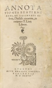 .1537.. LIBRO: .(HISTORIA).. .RHENANI, BEATRI:. .ANNOTATIONES... IN EXTANTES T. LIVII LIBROS. Lugduni [Lyon]: Apud Haeredes Simonis Vincentii, 1537. 8º menor. 232 p. Portada laminada. [Sigue:] .TITI LIVII PATAVINI LATINAE HISTORIAE PRINCIPIS DECAS...
