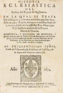 .1674.. LIBRO: .(HISTORIA- INGLATERRA).. .RIBADENEIRA, PEDRO, ET ALIA:. .HISTORIA ECLESIASTICA DEL SCISMA DEL REYNO DE INGLATERRA. Madrid: Imp. Real, 1674. 8º mayor. 12 h. + 564 p. Texto a dos columnas, con apostillas marginales y llamada. Grabado...
