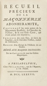IMPRIMÉS; PRÉCÉDÉS DES TROIS ÉLUS, & SUIVIS DU NOACHITE, OU LE CHEVALIER PRUSSIEN, TRADUIT DE L´ALLEMAND; [...] [SIGUE:] SECONDE PARTIE. CONTENANT LES CATÉCHISMES DES QUATRE PREMIERS GRADES, L´OUVERTURE & CLÔTURE DES DIFFÉRENTS LOGES, L´INSTRUCTION DE LA TABLE... [SIGUE:] MANUEL DES FRANCHES-MAÇONNES OU LA VRAIE MAÇONNERIE D´ADOPTION. Philadelphie: chez Philarethe, rue de l´Equerre a l´A-Plomb, 1787. Tres partes en un vol. en 12º. I: 2 h.+ IV + 115 p.+ 3 lám. plegadas. II: 2 h. + 148 p.+ 2 h.+ 1 lám. plegada. 98 p., posiblemente falta la portada de esta tercera parte. Un vol. enc. en plena piel jaspeada de la época con hierros dorados en el lomo, cortes pintados. Muy buen ejemplar. Edición original muy rara completa de las cuatro láminas que suelen faltar a casi todos los ejemplares.
