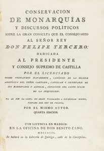 .1792.. LIBRO: .(HISTORIA).. .FERNÁNDEZ DE NAVARRETE, PEDRO:. .CONSERVACION DE MONARQUÍAS Y DISCURSOS POLÍTICOS SOBRE LA GRAN CONSULTA QUE EL CONSEJO HIZO AL SEÑOR REY DON FELIPE TERCERO. Madrid: Imp. de Benito Cano, 1792. 8º mayor. 4 h. + 476...