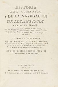 .1793.. LIBRO: .(COMERCIO-HISTORIA).. .HUET, PEDRO DANIEL:. .HISTORIA DEL COMERCIO Y DE LA NAVEGACION DE LOS ANTIGUOS. Escrita en francés por... Y traducida al castellano por el padre Pr. Fr. Plácido Regidor... de la Religión de San Benito... Con...