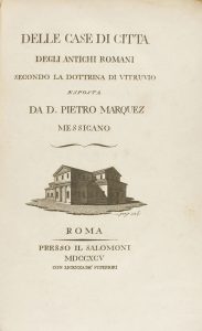 .1795. LIBRO: .(HISTORIA).. .MARQUEZ, PEDRO JOSÉ. [EL VITRUVIO MEJICANO].. .DELLE CASE DI CITTA DEGLI ANTICHI ROMANI SECONDO LA DOTTRINA DI VITRUVIO, ESPOSTA DA D. PIETRO MARQUES MESSICANO. Roma: presso il Salomoni, 1795. 8º mayor. 1 h. (portada...