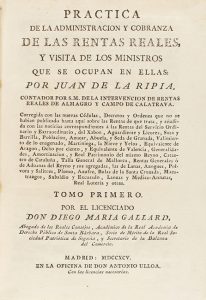 .1795-1796. LIBRO: .(HISTORIA ECONÓMICA). .RIPIA, JUAN DE LA; GALLARD, DIEGO MARIA:. .PRACTICA DE LA ADMINISTRACIÓN Y COBRANZA DE LAS RENTAS REALES... 5 VOL. COMPLETO. Madrid: Oficina de Antonio Ulloa, 1795-1796. 5 vol. en 8º. I: 4 h.+ 444 p. + 4...