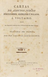.1822-1824. LIBRO: .(JUDAICA).. .[LÓPEZ, JOSÉ. ISAAC MONTENERO. BENJAMIN GROOT, ETC.]:. .CARTAS DE ALGUNOS JUDIOS PORTUGUESES, ALEMANES Y POLACOS, A VOLTAIRE: CON UN PEQUEÑO COMENTARIO DE OTRO MAYOR. TRADUCIDAS DEL FRANCÉS POR DON FERNANDO MARÍA...