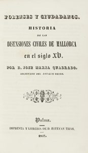 .1847. LIBRO: .(HISTORIA-MALLORCA).. .QUADRADO, JOSÉ MARIA:. .FORENSES Y CIUDADANOS. HISTORIA DE LAS DISENSIONES CIVILES DE MALLORCA EN EL SIGLO XV. Palma: Imprenta y Libreria de D. Estevan Trias, 1847. 8º mayor. 404 p. Cabeceras y culs-de-lampe....
