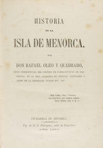.1874-1876.. LIBRO: .(MENORCA).. .OLEO Y QUADRADO, RAFAEL:. .HISTORIA DE LA ISLA DE MENORCA. Ciudadela de Menorca: Tip. de D. S. Fábregues, 1874-1876. 2 vols. 8º mayor. I: 647 p. II: 679 p.+ 4 h. para la lista de los suscriptores. Enc. de la época...