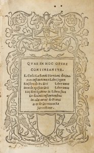 + 301 fol. (A8-B8, a8-z8, sign. 8, aa8-ss8). Primera hoja con orla xilográfica. Capitales xilografiadas. Texto en itálica. Primera hoja remarginada, taladro marginal en las primeras hojas y alguna mancha del tiempo. Enc. en pergamino, cortes dorados y cincelados. Obra de retórica clásica sobre la virtud del cristianismo y la ira de dios. Lactantius fue discípulo del gran Arnobio y varios emperadores requirieron sus servicios. Antiguas anotaciones manuscitas al margen. Brunet III, 736.