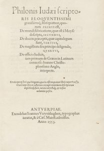 Anvers: Imp. Jan Verwithaghen, 1553. 8º mayor. 12 h.+ 149 p.(algún error de paginación)+ 4 h. Capitales xilografiadas, texto con apostillas marginales. Lavado. Enc. en pergamino reciente, lomera rotulada. Temprana colección de las obras del filósofo griego Filón de Alejandría. La traducción fue realizada por el humanista inglés John Christopherson, que fue confesor de la reina María Tudor.