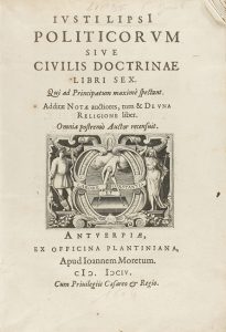 Politicorum notae, et de una Religione liber; De una religione, adversus, adversus dialogistam liber. [Sigue:] .IUSTI LIPSI MONITA ET EXEMPLA POLITICA LIBRI DUO QUI VIRTUTES ET VITIA PRINCIPUM SPECTANT. Id., 1605. 4 h. + 213 p. + 3 h. [Sigue:]. LEGES REGIAR ET LEGES X. VIRALES. I. LIPSII OPERÂ STUDIOSÈ COLLECTAE. .Editio ultima. Id., 1601. 8 h. Cada parte con portada propia con grabado tipográfico del emblema de la Officina Plantiniana. Capitales, culs-de-lampe. Texto con apostillas marginales, amplios márgenes. Intermitentes galerías marginales que no afectan texto, alguna p. tostada. Enc. en pleno pergamino de época, lomera rotulada com pequeña rasgadura en su parte superior, cantos rozados. Justus Lipsius (1547-1606) fue un humanista de origen belga, que realizó una serie de escritos destinados a reavivar los clásicos estoicistas de forma que fueran compatibles con el catolicismo. CCPB 337078-X; CCPB 496933-2; CCPB 128677-3.