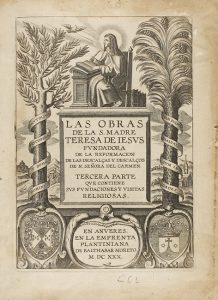 Anveres: Emprenta Plantiniana de Balthasar Moreto, 1630. 8º mayor. 351 p. + 43 h. Portada grabada al cobre con emblemas e imagen de Santa Teresa de Jesús. Primera h. con pequeñas rasgaduras marginales. Enc. en plena piel con superlibris en ambos planos desprendidos, nervios, cortes pintados; puntas muy rozadas y faltas en el lomo. Primera edición de Amberes. Palau 298512.