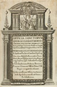 .1649.. LIBRO: .(RELIGIÓN).. .PACHECO, ANDREAE:. .OFFICIA SANCTORUM QUI IN ECCLESIA ET DIOECES CONCHEN, SPECIALITER CELEBRANTUR... Matriti: Typ. Regia, 1649. 8º mayor. Frontis con calcografía arquitectónica por Iuan de Noort + 8 h. + 143 p. texto...