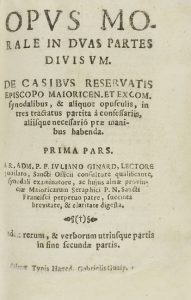 .1652-1653. LIBRO: .(CONFESIÓN).. .GINARD, FR. JULIAN:. .CASOS DE CONCIENCIA. OPUS MORALE IN DUAS PARTES DIVISUM. DE CASIBUS RESERVATIS EPISCOPO MAIORICENSIS ET EXCOM. SYNODALIBUS, & ALIQUOT OPUSCULIS, IN TRES TRACTATUS PARTITA A CONFESSARIS...