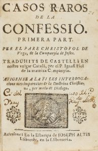 .[1679]. LIBRO: .(RELIGIÓN-CONFESIÓN).. .VEGA, CHRISTOFOL DE:. .CASOS RAROS DE LA CONFESSIÓ. PRIMERA PART [Y SEGONA]. TRADUHITS DE CASTELLÀ EN NOSTRE VULGAR CATALÀ, PER EL P. IGNASI FIOL DE LA MATEIXA COMPANYIA. AFIGENSE A LA FI LES...