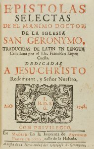 .1748. LIBRO: .(HUMANIDADES).. .SAN JERÓNIMO:. .[BRUGALLA] EPISTOLAS SELECTAS DE EL MÁXIMO DOCTOR DE LA IGLESIA SAN GERÓNYMO, TRADUCIDAS DE LATÍN EN LENGUA CASTELLANA POR EL LIC. FRANCISCO LÓPEZ CUESTA. Madrid: Imp. de Antonio Pérez de Soto,...