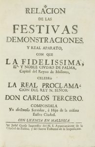 .[1759]. LIBRO: .(MALLORCA-FESTEJOS).. .REINES, JUAN:. .[FIESTAS A CARLOS III EN PALMA] RELACIÓN DE LAS FESTIVAS DEMONSTRACIONES, Y REAL APARATO, CON QUE LA FIDELISSIMA Y NOBLE CIUDAD DE PALMA, CELEBRÓ LA REAL PROCLAMACIÓN DEL REY N.S. DON CARLOS...