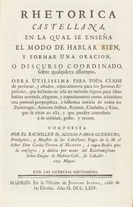 .1764.. LIBRO: .(LENGUA CASTELLANA). .PABON GUERRERO, ALONSO:. .RHETORICA CASTELLANA, EN LA QUAL SE ENSEÑA EL MODO DE HABLAR BIEN, Y FORMAR UNA ORACIÓN, Ó DISCURSO COORDINADO... Madrid: Imp. Joachin Ibarra, 1764. 8 mayor. 17 h. + 366 p. Ilustr....
