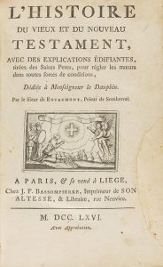 .1766. LIBRO: .(BIBLIA).. .ROYAUMONT, SIEUR DE:. .L´HISTOIRE DU VIEUX ET DU NOUVEAU TESTAMENT. AVEC DES EXPLICATIONS ÉDIFIANTES, TIRÉES DES SAINTS PÈRES, POUR RÉGLER LES MOEURS DANS TOUTES SORTES DE CONDITIONS, DÉDIÉE À MONSEIGNEUR LE...