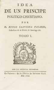 .1800-1801. LIBRO: .(POLÍTICA-EMBLEMAS).. .SAAVEDRA FAXARDO, DIEGO:. .IDEA DE UN PRINCIPE POLITICO-CHRISTIANO. Valencia: Oficina de Salvador Faulí, 1800-1801. 2 vol. en 8º. I: 8 h. + 491 p. II: 4 h. + 519 p. Portada con grabado tipográfico....