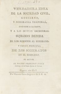 .1803- 1804. LIBRO: .(HUMANIDADES).. .DORCA, FRANCISCO:. .[ 4 IMPRESOS REUNIDOS EN UN VOLÚMEN] [1] VERDADERA IDEA DE LA SOCIEDAD CIVIL, GOBIERNO, Y SOBERANIA TEMPORAL, CONFORME A LA RAZÓN, Y A LAS DIVINAS ESCRITURAS: SUJECIÓN DEBIDA DE LOS...