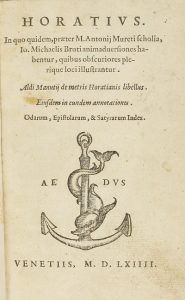 .1564.. LIBRO: .(LITERATURA CLÁSICA).. .HORATIUS FLACCUS, QUINTUS:. .HORATIUS. In quo quidem, praeter M. Antonii Mureti Scholia, Io. Michaelis Bruti...ODARUM, EPISTOLARUM, & SATYRARUM INDEX. Venetiis: Aldus, 1564. 8º menor. 15 h. + 176 fol. Falto...