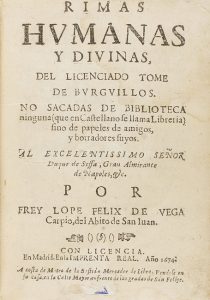 .1674.. LIBRO: .(LITERATURA- SIGLO ORO).. .VEGA CARPIO, LOPE FELIX DE:. .RIMAS HUMANAS Y DIVINAS, DEL LICENCIADO TOME DE BURGUILLOS. Madrid: Imp. Real, 1674. 8º. 8 h. + 160 fol. Cabeceras y capitales xilografiadas. Levísimo cerco de humedad en las...