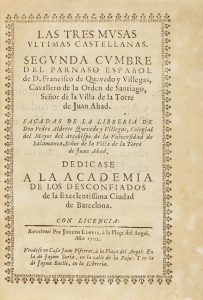 .1702.. LIBRO: .(LITERATURA).. .QUEVEDO, FRANCISCO DE:. .LAS TRES MUSAS ULTIMAS CASTELLANAS. SEGUNDA CUMBRE DEL PARNASO ESPAÑOL. Imp. Joseph Llopis. Barcelona, 1702. 8º mayor. 6 h.+ 343 p.+ 4 h. Texto a dos columnas. Portada con orla tipográfica....