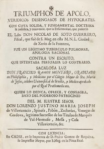 .1755.. LIBRO: .(LITERTURA).. .RAMOS MONTERO, FRANCISCO:. .TRIUMPHOS DE APOLO, VERÍDICOS DESENGAÑOS DE HYPOCRATES. CON CUYA SOLIDA, Y FUNDAMENTAL DOCTRINA SE JUSTIFICA, Y CONVENCE, QUE LA ENFERMEDAD, QUE PADECIÓ EL LDO. DON NICOLÁS DE SOTO...