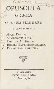 .1761. LIBRO: .(LITERATURA CLÁSICA). .OPUSCULA GRAECA AD USUM SEMINARII VILLAGARSIENSIS. I. AESOPI FABULAE; II. ANACREONTIS ODAE; III. EPISTOLA M. BASILII; IV. HOMERI BATRACHOMYOMACHIA; V. DEMOSTHENSIS PHILIPRICA. Villagarsie: Typis Seminarii, 1761....