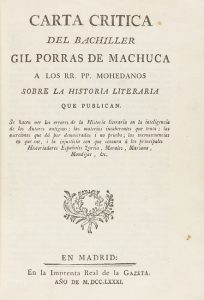 .1781. LIBRO: .(LITERATURA).. .[LÓPEZ DE AYALA, IGNACIO:].. .CARTA CRITICA DEL BACHILLER GIL PORRAS DE MACHUCA. A LOS RR. PP. MOHEDANOS SOBRE LA HISTORIA LITERARIA QUE PUBLICAN. Se hacen ver los errores de la Historia literaria en la inteligencia de...