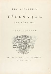 .1785.. LIBRO: .(LITERATURA).. .FÉNELON [FRANÇOIS DE SALIGNAC DE LA MOTHE]:. .LES AVENTURES DE TÉLÉMAQUE. TOME PREMIER.. [Paris]: Imp. de Monsieur, 1785. Folio menor. 6 h. + 309 p. + 32 lám. grabadas (de un total de 36). Portada con grabado...