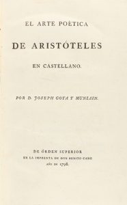 .1798.. LIBRO: .(LITERATURA CLÁSICA).. .ARISTOTELES:. .EL ARTE POÉTICA DE ARISTÓTELES EN CASTELLANO por D. Joseph Goya y Muniain. [Madrid]: Imp. de Don Benito Cano, 1789. 4º Mayor. 3 h. + VIII + 138 p. Ligeras señales de óxido. Texto paralelo...