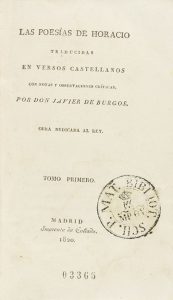 .1820.. LIBRO: .(LITERATURA CLÁSICA).. .HORACIO; BURGOS, JAVIER DE:. .LAS POPESÍAS DE HORACIO. Traducidas en versos castellanos con notas y observaciones críticas por DON JAVIER DE BURGOS. Madrid: Imp. de Collado, 1820. 4 vol. en 8º. I: 1 h. + XL...