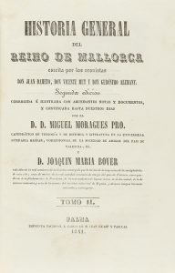 CON ABUNDANTES NOTAS Y DOCUMENTOS, Y CONTINUADA HASTA NUESTRO DIAS POR MIGUEL MORAGUES Y JOAQUÍN MARIA BOVER. Palma: Imprenta Nacional a cargo de Juan Guasp y Pascual, 1840. 8º mayor. I: Frontis litografiado, XXXVIII p.+ 1 h. + 547 p.+ 2 h. 7 lám. litográficas. II: 2 h., p. de la 550 a 1306 + 3 h. + 5 lám. III: XXIII-730 p.+ 1 h. + 17 lám. litográficas. Enc. de la época en media piel con filetes dorados en el lomo. Ejemplar en muy buen estado de conservación. Primera edición de la colección de crónicas del reyno de Mallorca. Los eruditos e historiadores Miguel Moragues y Joaquín María Bover trabajaron árduamente para configurar una sola historia de las Baleares a partir de las crónicas existentes, y la mejoraron incluyendo numerosas notas que hacen de esta edición la mejor de las antiguas. Las 29 láminas fueron dibujadas y grabadas en piedra litográfica por F. Muntaner y alguna por J. Alsina, y reproducen retratos de personajes de la historia balear y escenas de batallas en distintos puntos de su geografía. Palau 68213.