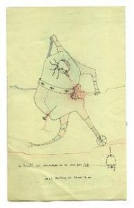 Dessin original à l’encre rehaussé aux crayons de couleur titré, légendé « La Beauté sera Convulsive ou ne sera pas. A.B. », dédicacé à André Breton et signé au recto par Camacho. Ce dessin figure au verso du catalogue de l’exposition Camacho à la galerie Raymond Cordier en 1962. Cette couverture qui devient le verso du dessin original proposé ici est rehaussée au crayon de couleurs par Camacho.