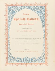 .1841. LIBRO: .(ROMANCES).. .LOCKHART, J.G.:. .ANCIENT SPANISH BALLADS; HISTORICAL AND ROMANTIC. TRANSLATED, WITH NOTES . [THE COLOURED TITLES, BORDERS, AND ORNAMENTAL LETTERS AND VIGNETTES, BY OWEN JONES].. London: John Murray, 1841. 4º menor. 132...