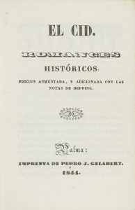 .1844. LIBRO: .(LITERATURA).. .CID RUY DÍAZ DE VIVAR:. .EL CID. ROMANCES HISTÓRICOS. EDICIÓN AUMENTADA, Y ADICIONADA CON LAS NOTAS DE DEPPING. Palma: Imprenta de Pedro J. Gelabert, 1844. 12º. 243 p. Anchos márgenes. Cubiertas originales con orla...