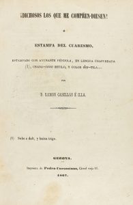 .1867. LIBRO: .(LITERATURA).. .CASELLAS E ILLA, RAMÓN:. .¡DICHOSOS LOS QUE ME COMPREN-DIESEN! Ó ESTAMPA DEL CUARESMO, ESTAMPADO CON AYUNANTE PÉNDOLA, EN LENGUA CHAPURRADA (1), CHABA-CANO ESTILO, Y COLOR DES-TILA. Girona: Imprenta de Pedro...