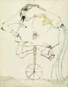 Technique mixte sur papier, encre, crayon et pastel signé, titré daté au recto « El viaje en traoleta » par Camacho. Superbe œuvre de Camacho.