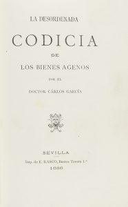 .1886. LIBRO: .(LITERATURA).. .GARCÍA, CARLOS:. .LA DESORDENADA CODICIA DE LOS BIENES AGENOS. OBRA APAZIBLE Y CURIOSA, EN LA QUAL SE DESCUBREN LOS ENRREDOS Y MARAÑAS DE LOS QUE NO SE CONTENTAN CON SU PARTE. Sevilla: Imprenta de E. Rasco, 1886....