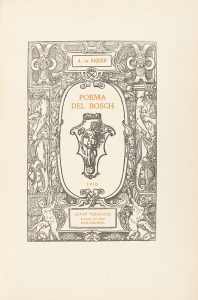 .1910.. LIBRO: .(LITERATURA).. .RIQUER, ALEXANDRE DE:. .POEMA DEL BOSCH. Barcelona: Tip. La Académica, 1910. 4º menor. 161 p. Textos enmarcados a dos tintas, ilustrado con viñetas. Rústica original ilustr. Sello de caucho de anterior poseedor.